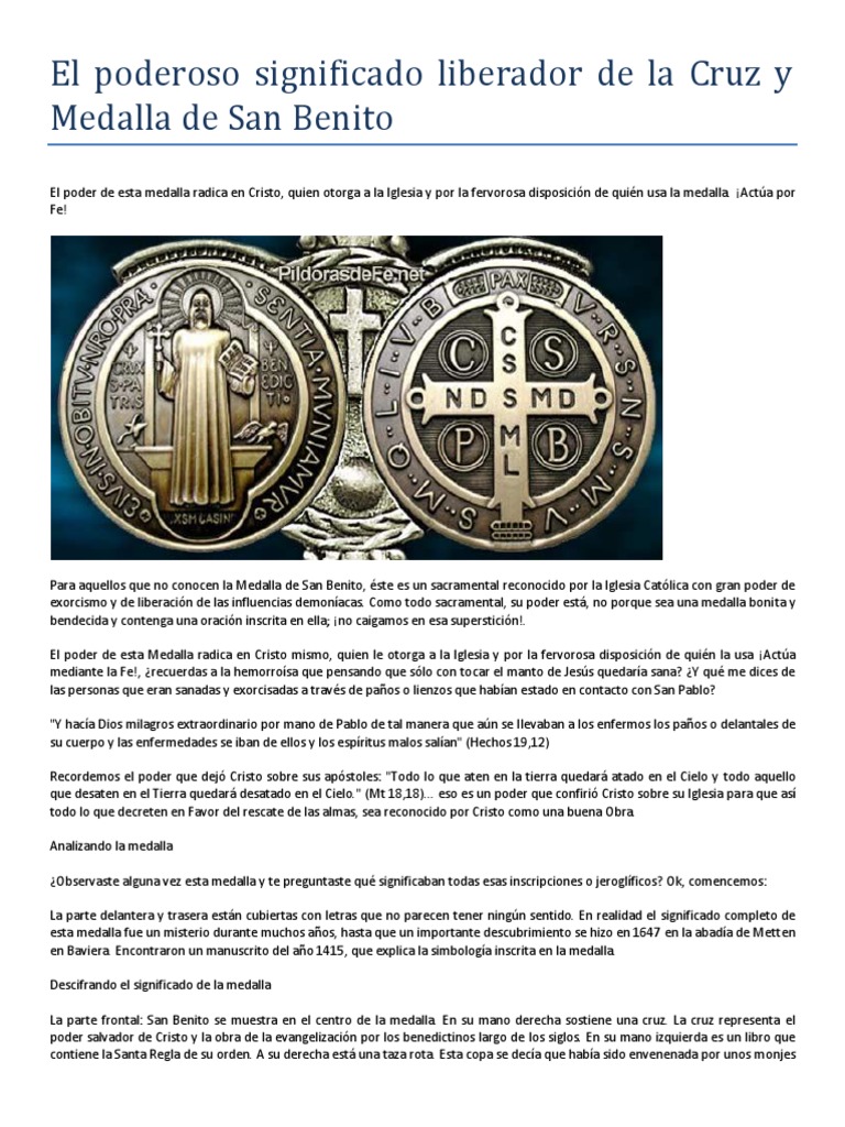 Mucho se dice sobre la medalla de san benito, por esta razón y para hacerle un merecido homenaje a este querido santo en su fiesta, decidimos explicarte de una. Que dios manifieste sobre él su poder, es nuestra humilde súplica. Representa la unidad, la armonía y la infinitud del universo mediante el equilibrio de. Es el príncipe de los arcángeles y de las hostias angélicas, el defensor de la fe y el ángel de la liberación. La misma presenta por un lado la imagen del santo patriarca, y por el otro, una cruz y en ella y a su alrededor las siglas de una oración.