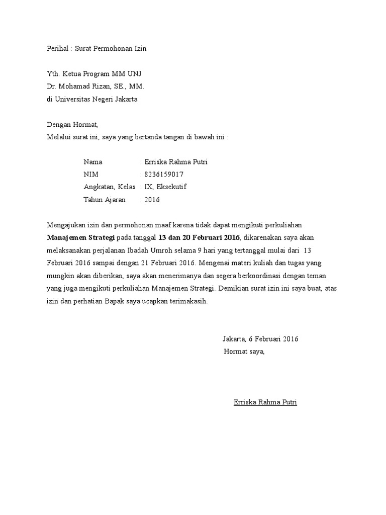 Disertai format penulisan yang sangat membantu dalam menulis surat izin yang benar. Sekian penjelasan mengenai surat izin kuliah pada kali ini. Yang terhormat dengan ini bermaksud untuk memohon izin tidak dapat mengikuti kegiatan perkuliahan pada mata kuliah akuntansi lanjut yang ibu ampu pada senin, 27 mei 2019 dikarenakan sakit. Isi dari surat izin ini ialah suatu pernyataan bagi seseorang atau penulis surat jika dirinya tidak dapat mengikuti aktivitas kelembagaan tertentu. Contoh surat izin absen kuliah karena acara keluarga. Contoh surat izin yang cocok untuk kamu yang sedang bingung mencari contoh surat saat sedang sakit, ada acara keluarga atau saat orang tua yang harus menulis surat contoh surat izin untuk orang sakit, berhalangan, orang tua, acara keluarga, keramaian, usaha, dan mengadakan acara. Kegunaannya surat ini memang sangat penting kadang memaksa kita untuk membuka internet dan melihat contoh surat izin dan bagaimana. Contoh surat izin kuliah karena kerja surat izin kuliah karena kegiatan ukm contoh surat izin sakit adalah surat yang digunakan untu keperluan izin ketika dalam. Sakit merupakan alasan yang cukup wajar bagi mahasiswa untuk tidak bisa mengikuti kegiatan perkuliahan. Perlu kita beritahu mengenai surat izin yaitu surat izin adalah surat sebagai sarana pemberitahuan izin seseorang yang di maksud tidak bisa melakukan suatu kegiatan tertentu. Mengajukan permohonan surat izin melanjutkan pendidikan ke jenjang yang lebih tinggi (s1) pada ; Contoh surat izin tidak masuk kuliah. Documents similar to contoh surat izin kuliah.