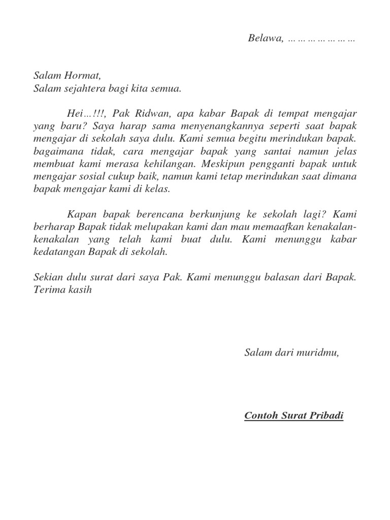 Pada umumnya paragraf pembuka didalam surat pribadi ini berisi tentang ekspresi luapan rasa rindu, menanyakan kabar atau yang. Bunda mariah, pesan ini saya sampaikan buat memberikan kabar gembira kepada bunda. Pasti kamu tambah cantik dan tambah pintar dan tambah segalanya deh. Untuk bundaku tercinta malang, 15 april 2019. Contoh surat pribadi untuk keluarga dalam bahasa inggris. Berikut adalah beberapa contoh surat pribadi untuk guru yang bisa anda jadikan sebagai bahan referensi. Kak ayu, besok liburan semester pulang ke jakarta nggak? Setiap murid tentu punya guru idolanya semasa sekolah. Hampir semua orang menggunakan surat karena memang saat itu belum ada teknologi yang dapat menjadi solusi untuk berkomunikasi selain membuat surat. Alhamdulillah bu, kemarin saya lolos dalam olimpiade matematika nasional dan. Menulis surat pribadi untuk guru bukanlah perkara yang susah. Surat pribadi adalah surat yang berfungsi untuk memberikan kabar kepada keluarga, teman, atau sahabat. Kami menunggu kabar kedatangan bapak di sekolah.